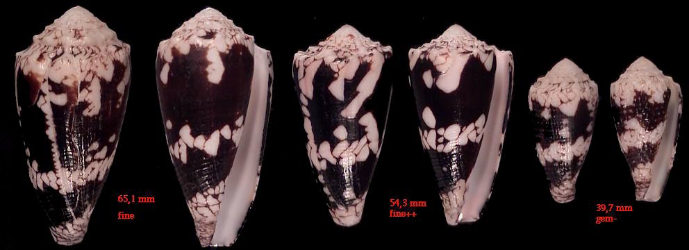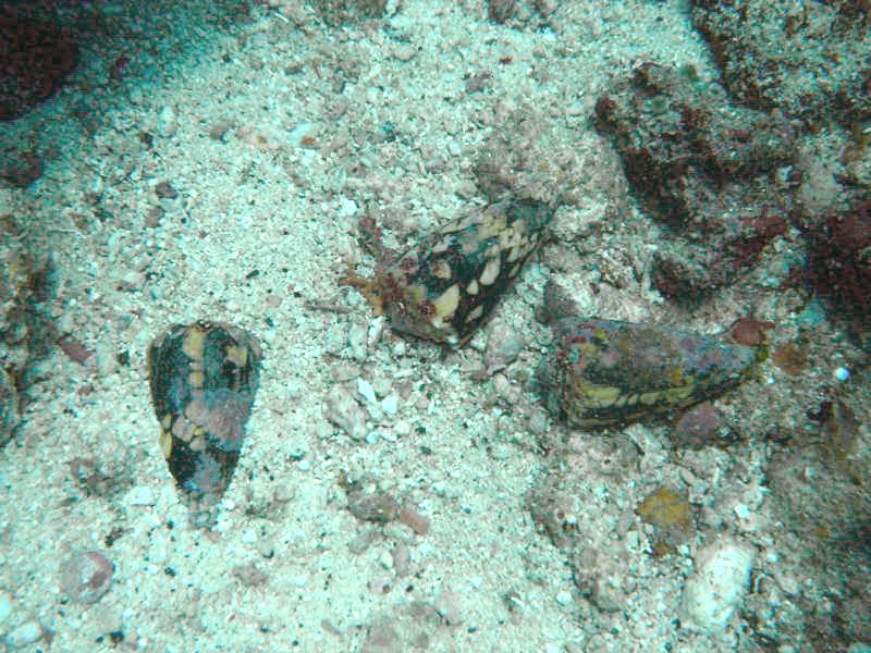 Auf unserer Tour mit der MV Empress im Oktober 2005 erreichten wir den Süden Halmaheras, den äußersten Westen Irian Jayas und Ceram. An verschiedenen Stellen stießen wir auf den seltenen Conus nocturnus, der dort offensichtlich sein Verbreitungsgebiet hat. Man kannte diese Art hauptsächlich aus alten Sammlungen, die vor gut 200 Jahren angelegt wurden und Material enthielten, das als "Beifang" im Gewürzhandel mit den Banda-Inseln anfielen. Auf Banda selbst haben wir nocturnus nicht gefunden. Conus nocturnus steht bandanus und marmoreus nahe, die beide eigenartigerweise nicht innerhalb seines Verbreitungsgebietes vorkommen. Es handelt sich um eine valide Art, eine umfangreiche Untersuchung dazu wird in Kürze publiziert. Das Habitat reicht von 1 m bis 50 m Tiefe. Man trifft die Tiere tagsüber halb vergraben im Sand, meist unter Überhängen oder toten Korallen an. Nachts haben wir diesen molluscivoren Conus bei der Jagd auf Co. miles beobachtet. Die Gehäuseform variiert stark, charakteristisch ist die hohe Spira mit einer typischen feinen Netzzeichnung, die von zwei kompakten Bändern unterbrochen wird. Das Gehäuse ist schlanker als die von marmoreus und bandanus. Es gibt stark granulierte und glatte Gehäuse, mit diversen Übergangsformen. ![]() ![]()